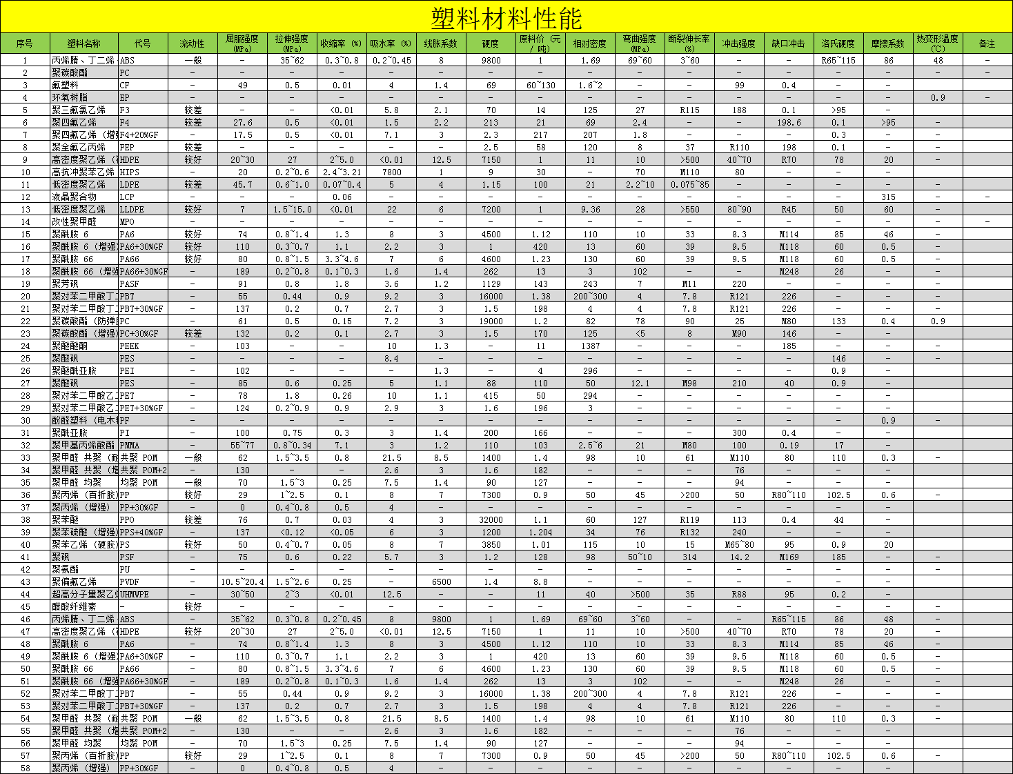 收录 ABS、PC、PA6、PA66、POM、PP、PPS、PEEK 等主流塑料牌号及增强改性材料,包含密度、拉伸强度、弯曲强度、收缩率、吸水率、热变形温度、硬度、摩擦系数等机械设计核心参数